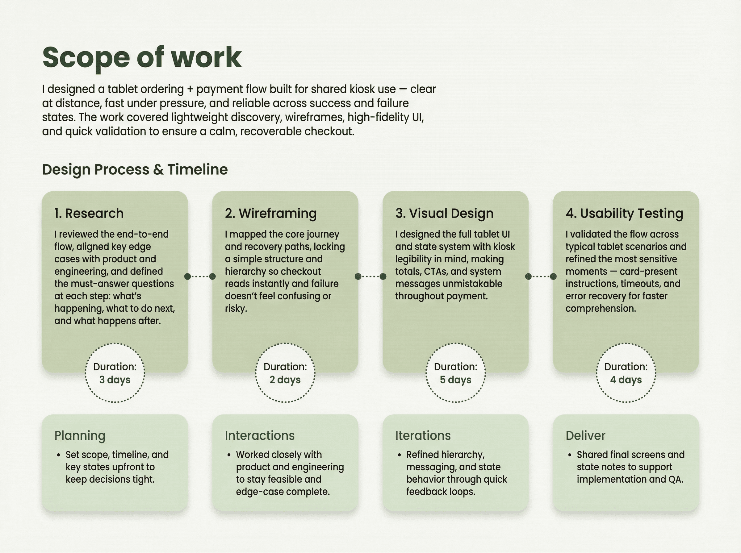 I designed a tablet based payment experience for a shared B2B ordering kiosk, where checkout is a high-pressure moment (queues, shared device, hardware/network friction).